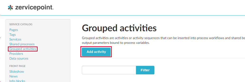 Grouped Activities are sequences of activities that can be reused in multiple processes and ZP services. They act as an isolated part of the process workflow, containing their own variables and activities, and taking input and output parameters that are assigned to variables used by the different activities within the grouped activity. A grouped activity can contain all the different built-in activities except Approval and Task as well as provider activities.