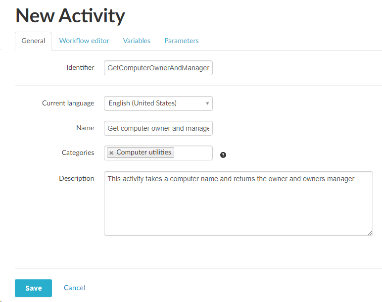 On the General tab we enter an identifier, a name and a description for the grouped activity. We also select a category. The new grouped activity will be available in the Activities menu of the process/service Workflow Editor under the Computer utilities category.