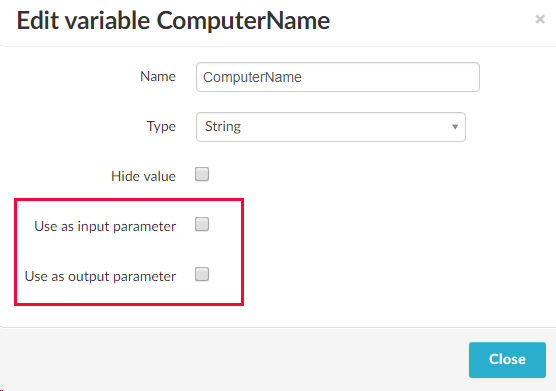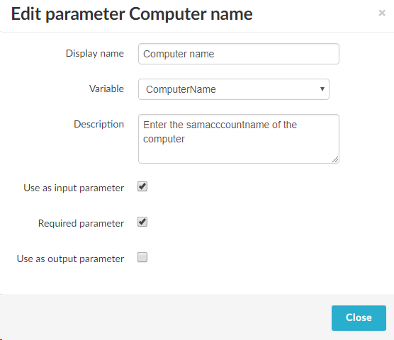 This will bring up the Edit parameter dialog with a variable already selected, in this case ComputerName (we can use the Variable dropdown to select another variable). We want to use the ComputerName variable as an input parameter, but we also want to make it a required parameter (the workflow won't really work without it) so we check the Required parameter box. We also change the display name to Computer name (looks nicer than ComputerName) and add a description as well.