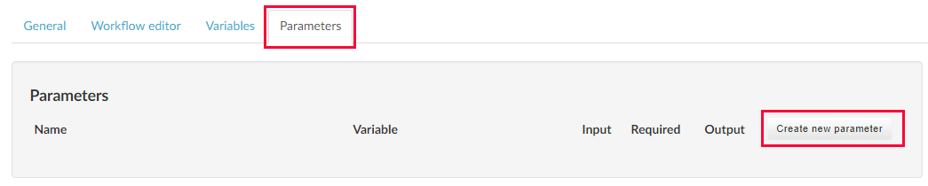 When we're done creating the variables and the workflow, it's time to define the input and output parameters for the grouped activity. To create a parameter we go to the Parameters tab, then click the Create new parameter button.