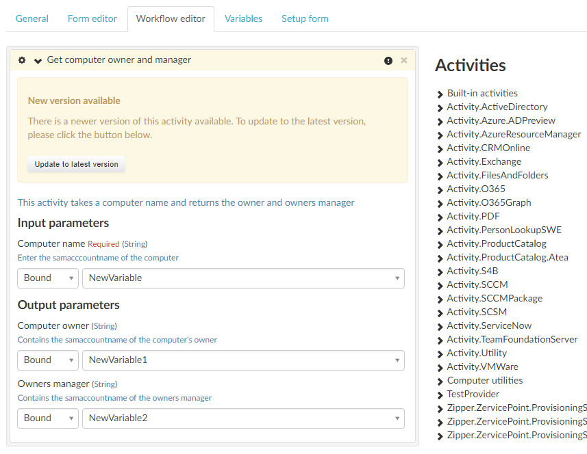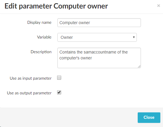 Our grouped activity is designed to take a computer samaccountname as input and return the samaccountname of the owner and of the owners manager . Therefor we need to define two output parameters so that the owner and owners manager information can be accessed in the containing process. In this grouped activity this information is stored in the two variables named Owner and OwnersManager. So we click the Create new parameter button again and select the Owner variable, set a display name and a description, and uncheck the Use as input parameter box (this will automatically check the Use as output parameter box instead).