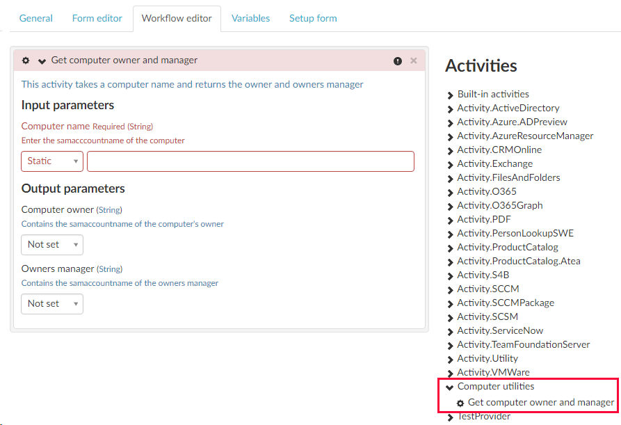 Using a shared activity in a shared process or standalone service is much like using a provider activity. In the workflow editor of the process, the grouped activities are listed alongside built-in and provider activities under Activities on the right side of the workflow designer. Here we have created a new shared process and dragged the Get computer owner and manager grouped activity into the workflow designer. The activity header's red background indicates that we have not yet provided all of the required parameters. Notice the parameter names and descriptions that we entered when we created the parameters.