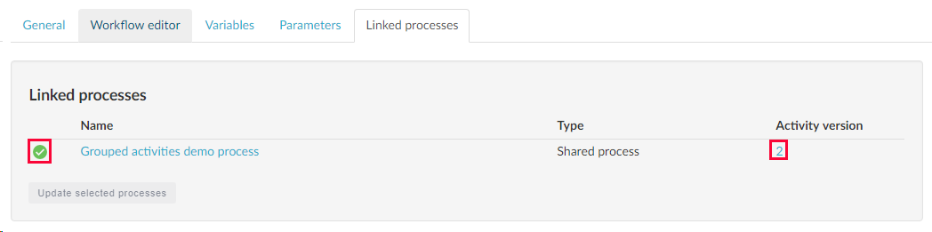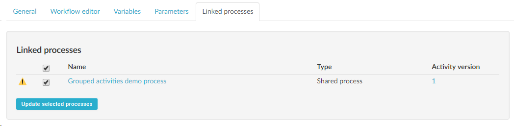 When a grouped activity is used in many processes it may not be practical to update the activity from within each process. Instead you can choose to push the update to the linked processes from within the grouped activity itself. To do this, open the grouped activity and select the Linked processes tab. Here you will see a list of shared processes and standalone services that use the activity. In the picture below the activity is only used in one process. Notice the warning icon indicating that the process is using an old version of the activity. Also notice the number in the Activity version column telling you what version (or versions) of the activity is used in the process (the current version number is displayed under the General tab). To update the process, select it using the checkbox next to it and click the Update selected processes button.
