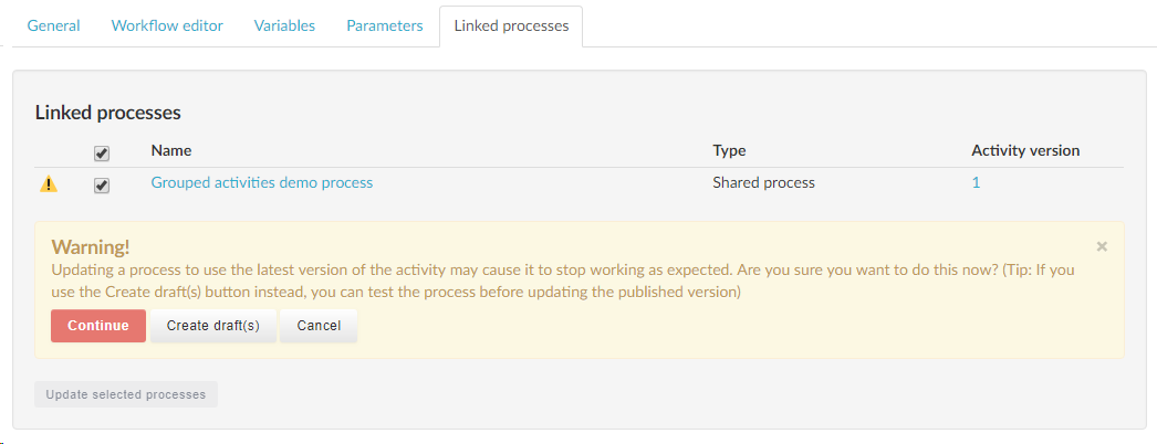 You will get a warning message about the risks of updating published processes along with a Continue button and a Create draft(s) button. If you click the Create drafts(s) button the updated process will be saved as a draft version which you can test before pushing the update to the published process. If you click Continue the updated grouped activity is pushed to the published process.