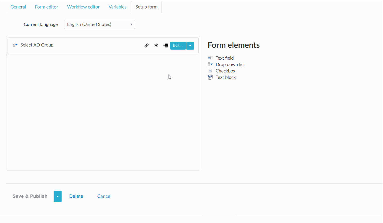 In the setup form we add a dynamic data source to a drop down list and bind it to a variable called ADGroup.