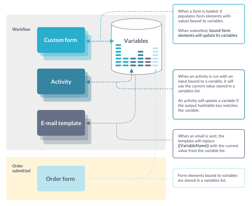 Fields in the Order Form can be bound to a variable. Any field that is bound to a variable will pass its value to the Variable List. This variable list is unique and is created for each order.