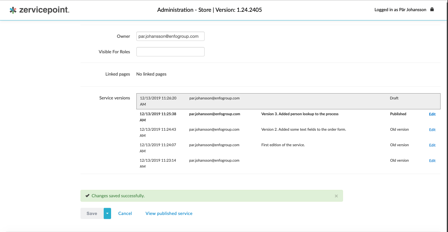 The service version functionality was introduced in Zervicepoint release 1.19 and it consists of two parts, draft and version handling. It has also been enhanced in release 1.23 as comments to versions was added.