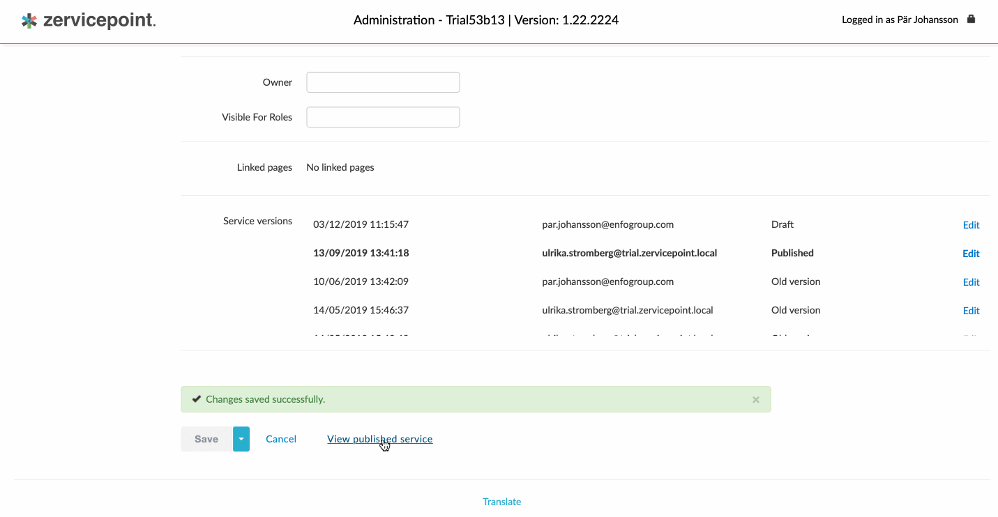 - Old version: An earlier version of the published version. The comment field will, in case properly filled out, indicate what changes that has been done to the versions. The date indicates when the service was created and published. By clicking "Edit" you will enter the service and once inside of it you have the option to "Save&Publish". This is how you make old versions published.