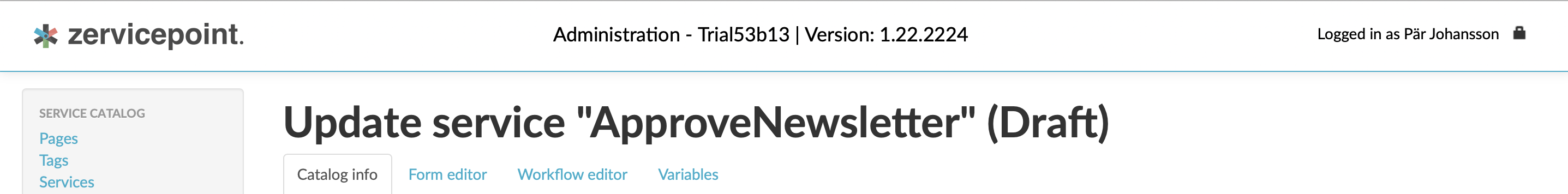 In Zervicepoint a new version of a service is created once changes are done and they are Saved & Published. These versions are saved in the service version list. In the list you will also find a draft if it exists. All published versions will be stored in the database and you can at any time revert to another version of the same service. This is simply done by going into the service and go to the tab Catalog info in which you will find a service version list. Click "edit" on the version you want to change to.