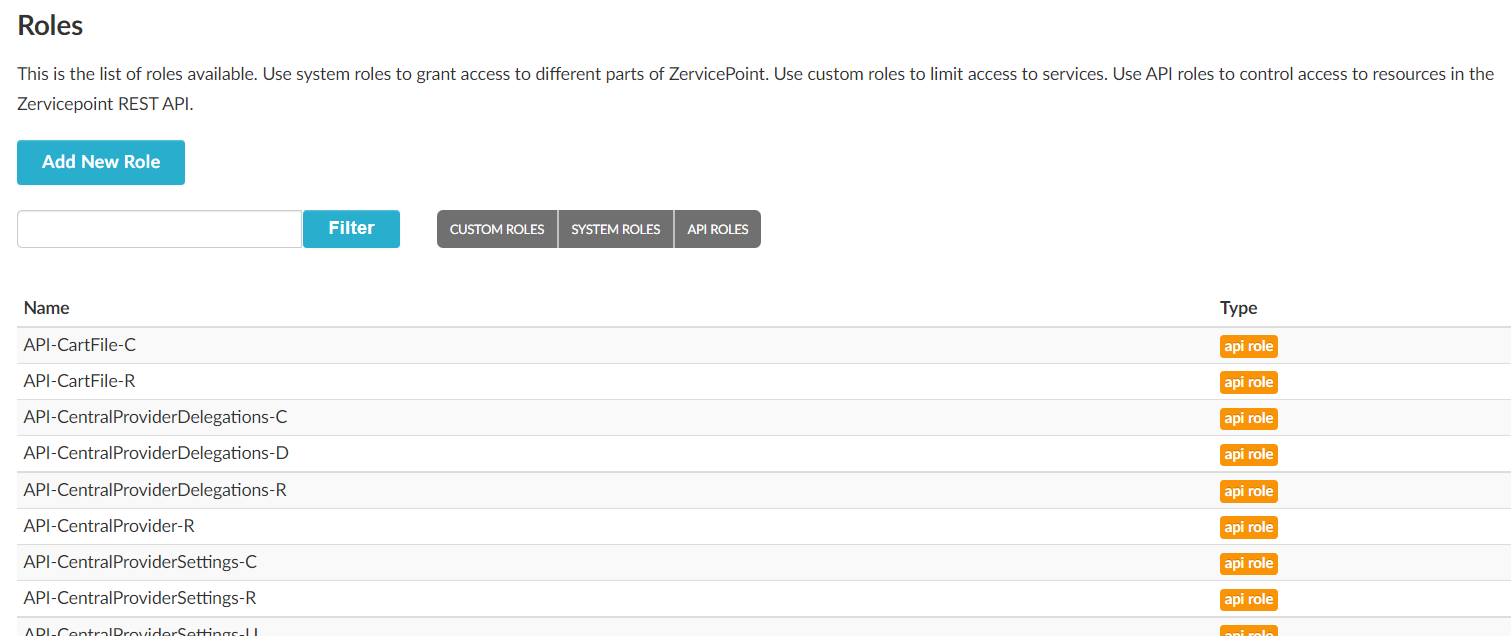 Because there are now so many more roles we've added some filtering functionality in the Roles view. You can now select what types of roles (Custom, System or API) that will be listed (API roles are excluded by default). And of course you can also search for a specific role.
