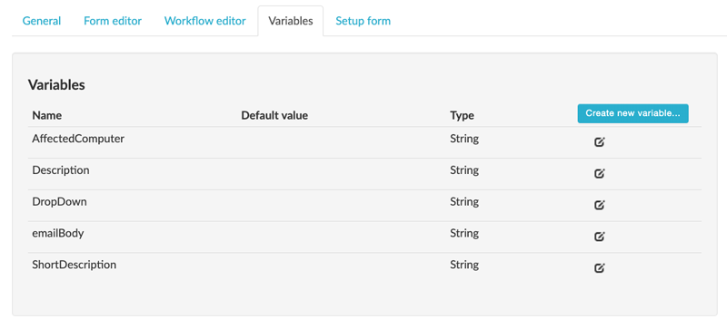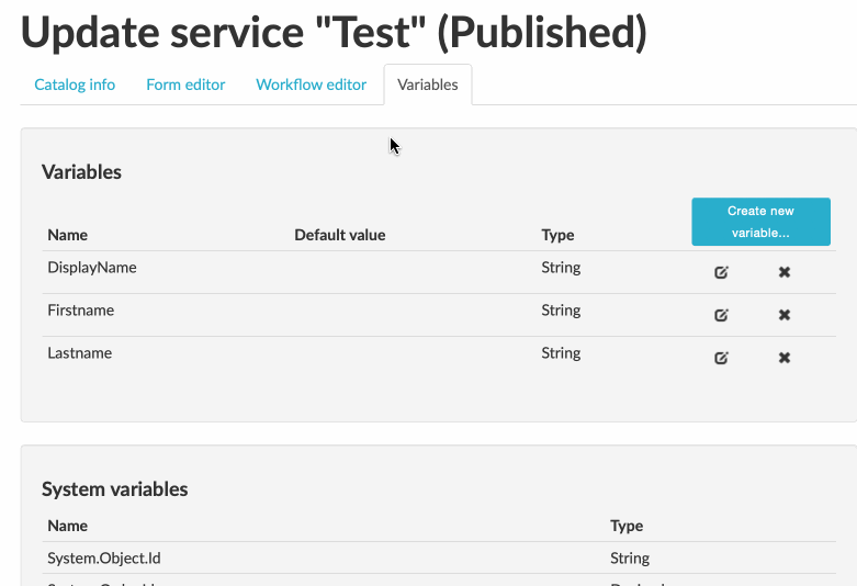 Variable tab will list your created variables and built-in system variables. Here you can manage all variables that belongs to the service.