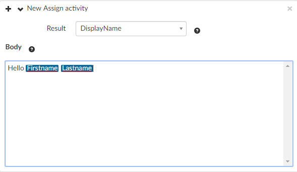 Hello @Firstname @Lastname (The text in body will be assigned to the variable DisplayName).