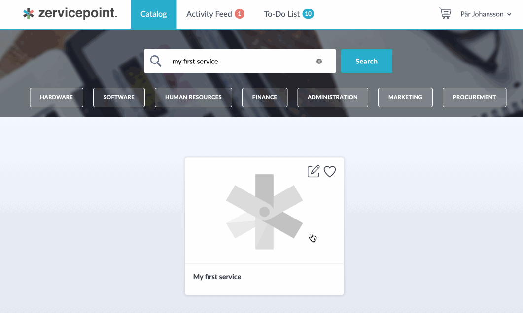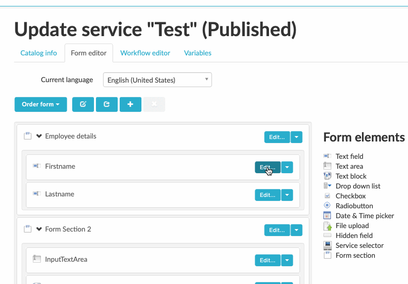 Find the service in user view, fill out the fields Firstname and Surname, and place an order. The result should display Hello <firstname> <lastname> as a status message.