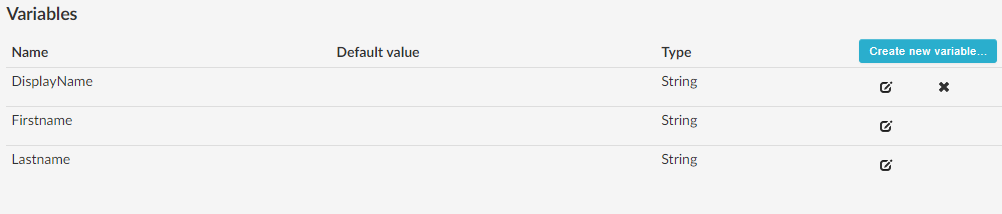 Click Create new variable and create a variable called DisplayName, make sure the type is ‘String’. Do the same procedure and add the variables Firstname and Lastname.