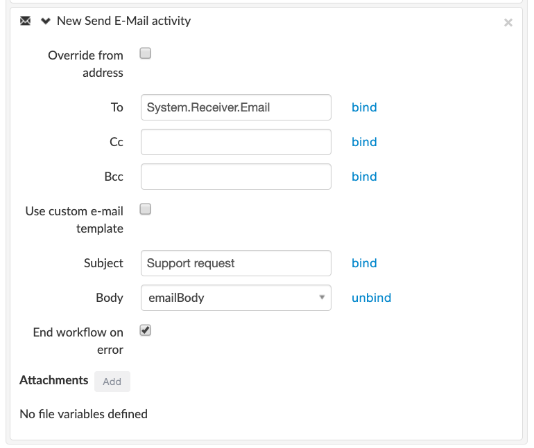 Add a New Send E-mail activity and click Save. Fill out the fields (the System. Receiver.Email variable is bound to your email). Bind the emailBody variable.