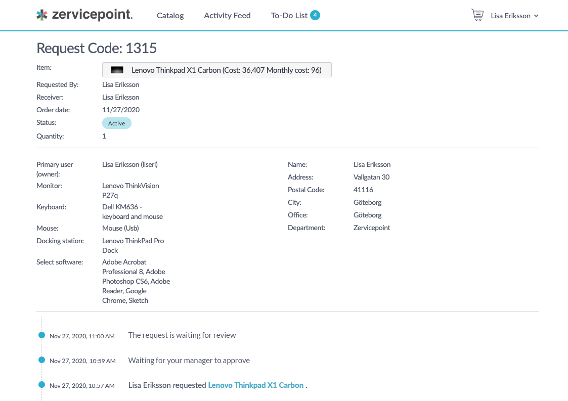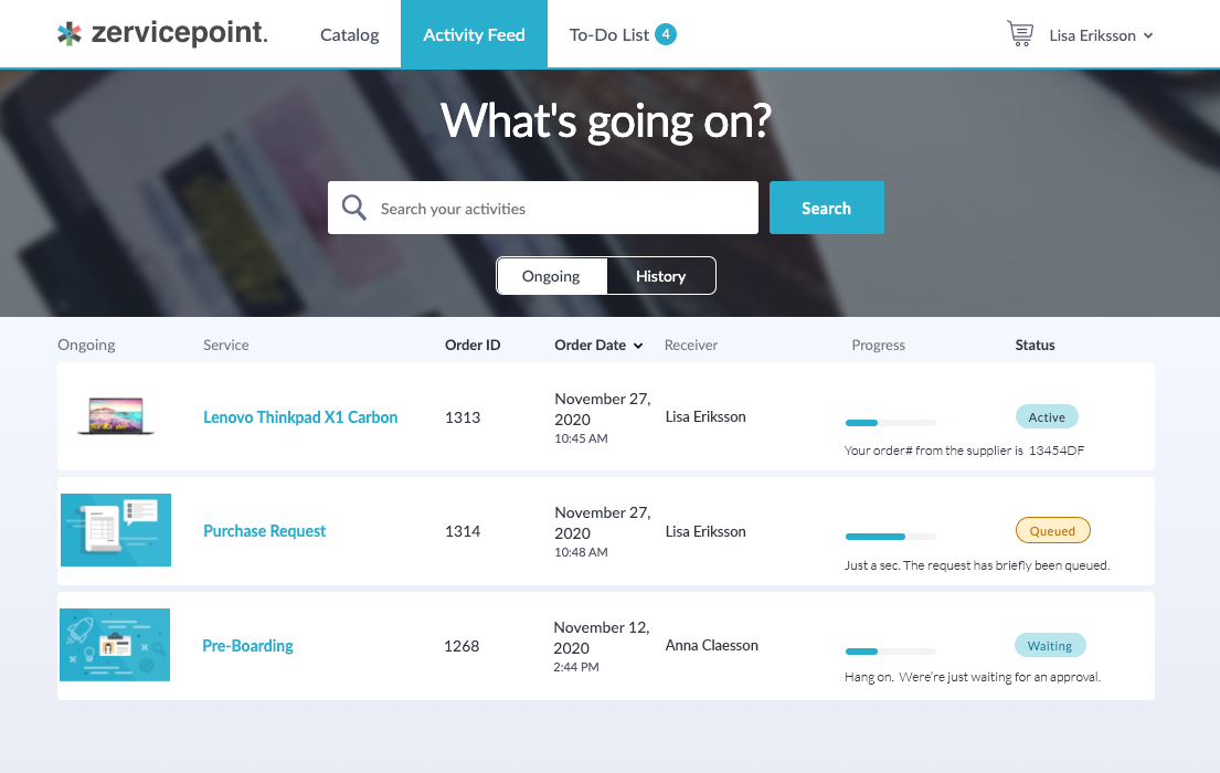 The Activity feed displays the status of each request, in real time. If it has been approved, the request enters a new state, and the new status will be displayed. This makes it it very easy for the user to follow their orders and requests!